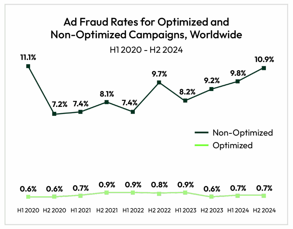 Ad fraud siphoned off an estimated $100 billion in ad spend in 2024. Alarmingly, the rate of fraud for non-optimized campaigns hit 10.9% – a four-year high. Even worse, the volume of campaigns running without fraud protection rose 81% globally, signaling a dangerous overreliance on outdated verification methods.